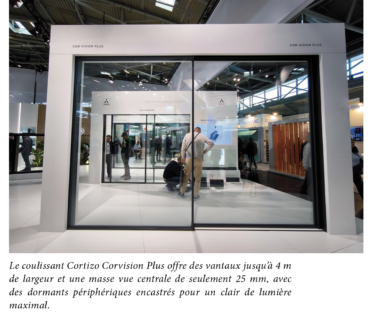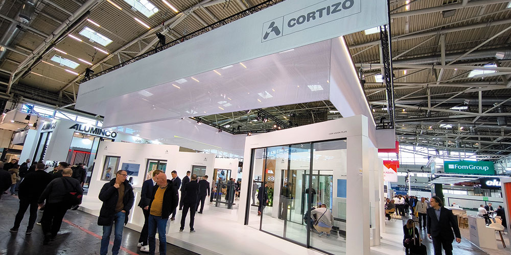 Cortizo est capable de produire 100 000 tonnes d’aluminium issu à 100% du recyclage dans sa nouvelle fonderie de Coirós près de La Corogne. A BAU, Cortizo présentait le store intégré dans la parclose supérieure pour le COR 80 Industrial, les parecloses latérales servent de guide au store : le store demeure aligné, même lors des manœuvres d’ouverture et de fermeture du vantail. Pour les solutions à ouverture à frappe ou oscillo-battante à ouvrant caché COR 80 OC et COR 70 OC, Cortizo proposait la première poignée invisible du marché. La nouvelle gamme Repliable Plus présente une masse vue de 110 mm entre vantaux et une meilleure performance thermique et acoustique. En ouverture intérieure ou extérieure, elle offre de 1 à 14 vantaux. Cortizo réaffirme son engagement envers le minimalisme avec la présentation de deux nouveaux systèmes coulissants conçus pour couvrir de grandes ouvertures. Le 4600 Plus Coulissant à Levage, préparé pour supporter des vantaux allant jusqu’à 3,3 mètres de hauteur, 3,3 de largeur et un poids maximal de 400 kg. Cela permet de grandes surfaces vitrées qui, accentuées par une masse vue périmétrique de seulement 120 m, offrent des vues infinies n’interrompues que par une chicane de 50 mm.