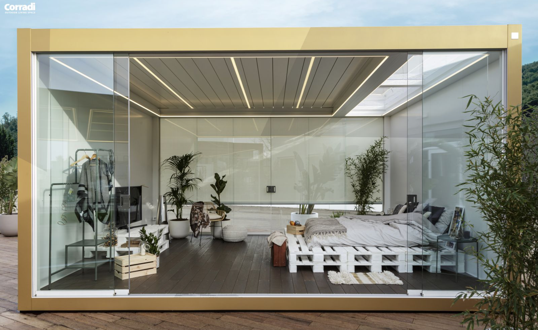 « Imago est née d’une vision inédite de l’espace extérieur. L’idée qui en a guidé le développement est le dépassement du concept de produit outdoor pour entrer dans la dimension du lieu à vivre, pleinement, en extérieur. C’est quelque chose qui va au-delà non seulement du concept de produit, mais aussi du concept d’espace. Jusqu’à présent, nous avons imaginé Imago en trois déclinaisons qui incarnent son potentiel : Imago Gourmet dédiée à la cuisine hors de la maison, Imago Feeling Good créée pour s’immerger dans un espace de bien-être et Imago Dreaming conçue comme une chambre à coucher, une provocation qui veut repousser les limites de l’outdoor là où elles nous semblaient inimaginables auparavant. Mais Imago peut s’adapter à beaucoup d’autres exigences, satisfaire beaucoup d’autres envies, car c’était notre objectif dès le début : combiner une personnalisation extrême avec l’innovation et l’élégance de Corradi »
