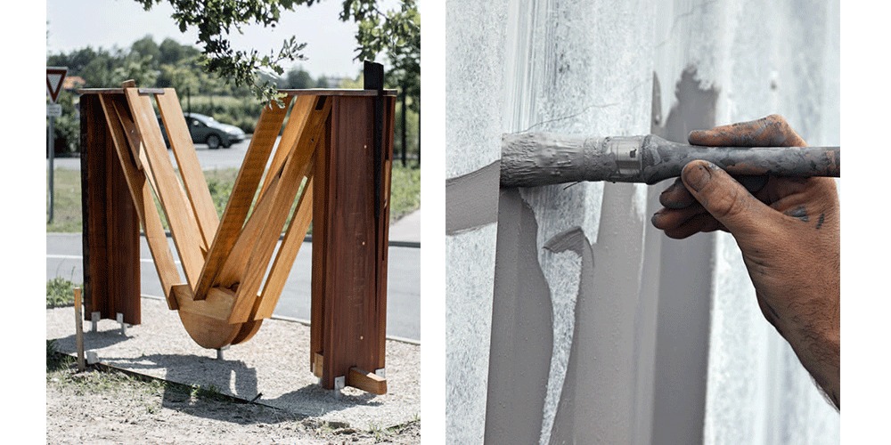 Le designer Marc Juran et les ébénistes-designers Malvin Gaborit et Millimètre s’associent pour concevoir la sculpture Murmures et l’arbre Millet. Ces deux pièces sont conçues avec d’anciens montants de fenêtres et des chutes de PVC. L’ébéniste-designer Mariano Calezado conçoit un M monumental uniquement avec les chutes de bois fournies par le Groupe MILLET.