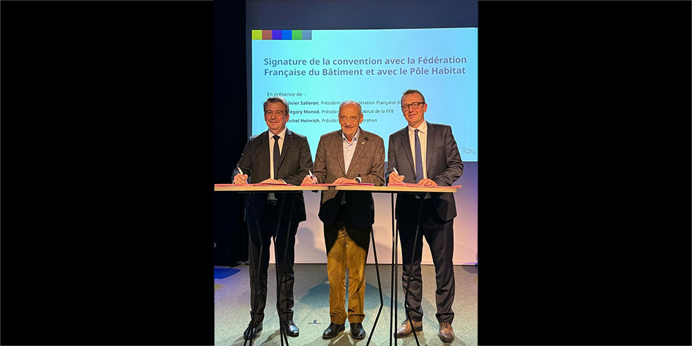 Ce lundi 18 novembre, Olivier SALLERON, Président de la Fédération Française du Bâtiment (FFB), Grégory MONOD, Président du Pôle Habitat FFB, et Michel HEINRICH, Président de la Fédération nationale des Schémas de Cohérence Territoriale (SCoT), ont signé un partenariat inédit pour rapprocher leurs entités respectives au niveau national et local. Un renforcement des liens entre acteurs publics et privés placé au service des transitions urbanistiques, écologiques et énergétiques.