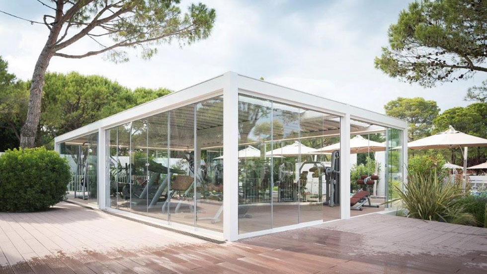 Isola 3 est une pergola à membrane qui se distingue par sa forme cubique. Son toit légèrement vouté garantit une protection totale de la pluie. L’intégration des fermetures périmétrales dans les travées renforce les lignes minimalistes de cette structure.
