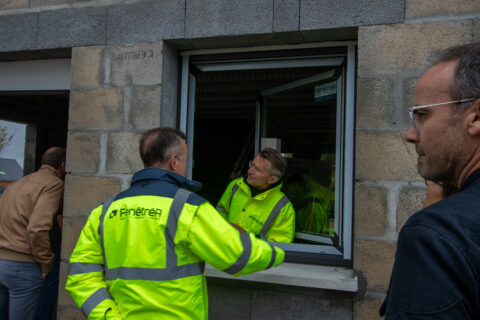 Sous un ciel voilé mais devant une équipe enthousiaste, les encadrants de FenêtréA se sont réunis pour assister à la pose de cette première fenêtre, réalisée par la société SPPM, client historique de l’entreprise également implanté à Beignon.
