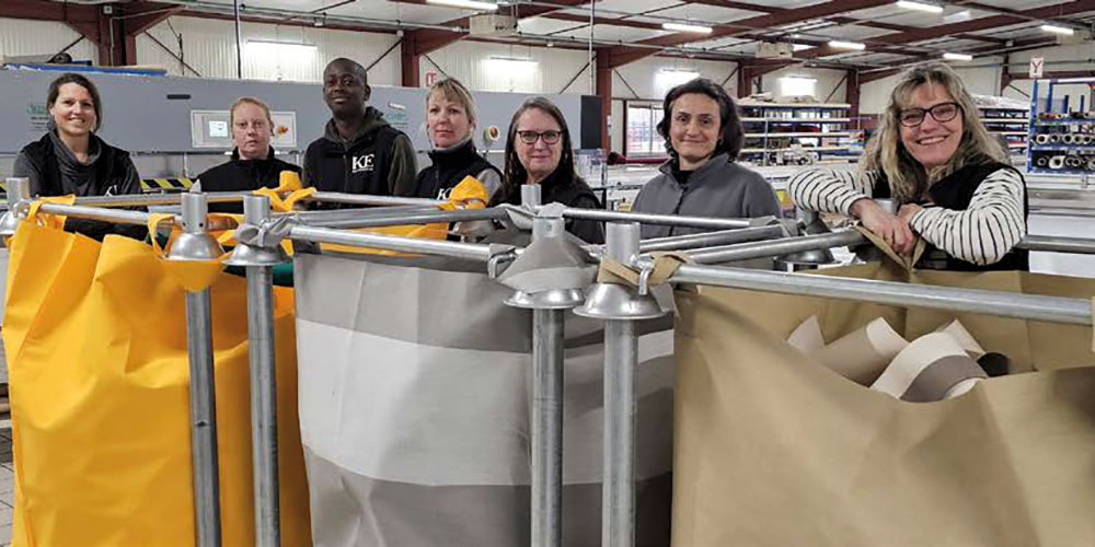 Au-delà de la réduction drastique de ses déchets industriels banals (DIB), KE France a développé une filière de recyclage de ses chutes de production avec son fournisseur de toiles. Les coupons de toiles acryliques sont ainsi collectés, recyclés puis retissés pour intégrer de nouvelles toiles. Cette initiative a permis le recyclage de 7 tonnes de toiles en 2024.