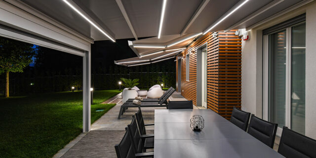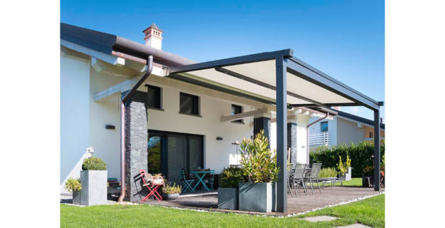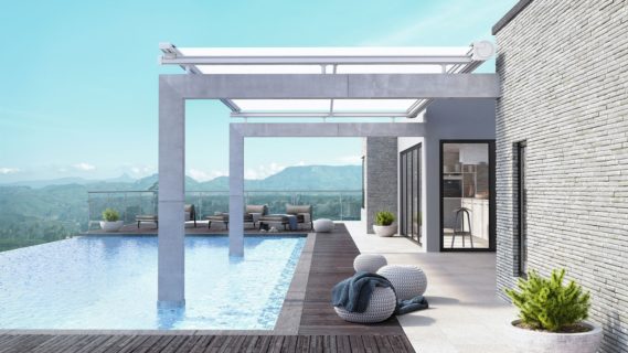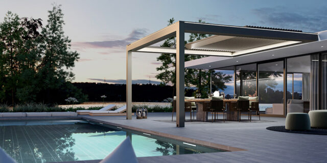 Avec Generosa, KE Outdoor Design propose un store banne en grandes largeurs : sur-mesure de 1 370 à 11 780 mm pour une avancée de 1600 à 4 100 mm. Dédié aux grandes terrasses, modulable, il décline de multiples options : supports déco gold, bras LED, bras croisés, rampe lumineuse, etc.