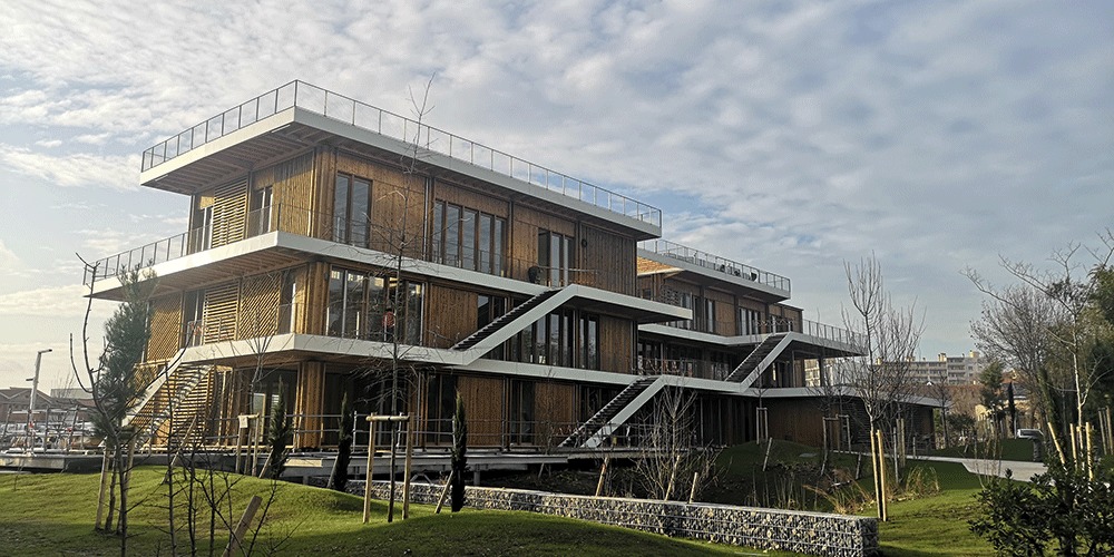 Détachée du bâtiment principal, la Maison des Services se situe au cœur du grand parc arboré du site Latécoère à Toulouse. ICADE la désirait divergente des bâtiments de bureaux métalliques. Compte tenu de son environnement végétal, elle est entièrement en bois (mélèze et épicéa) et a été conçue dans une démarche vertueuse de consommation locale. C’est donc l’entreprise Pyrénées Charpentes qui a usiné et mis en œuvre toute l’ossature bois et l’Agence Lorillard Occitanie qui a assemblé et posé les menuiseries bois. De forme rectangulaire, elle se déploie sur deux niveaux au-dessus du rez-de-chaussée. Elle offre à chaque niveau de larges baies vitrées dont certaines donnent sur des terrasses matérialisées par la largesse des débords de toiture.