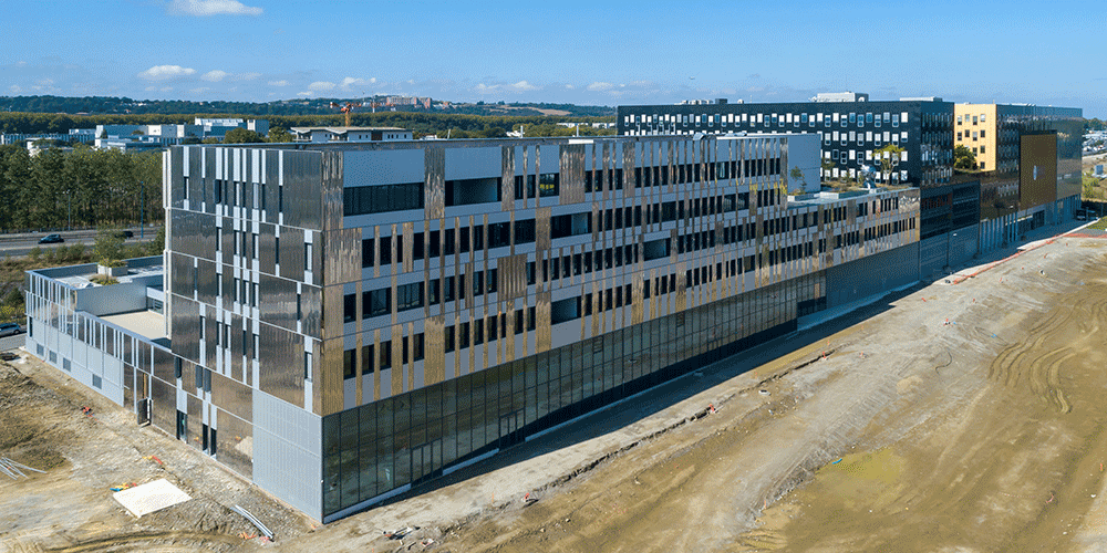 La maison de formation Jacqueline Auriol accueillera 2500 étudiants dans ce bâtiment de 15 000 m2. Murs-Rideaux de la gamme Geode et bandeaux vitrés Soleal 65 de Technal viennent maximiser les apports solaires.