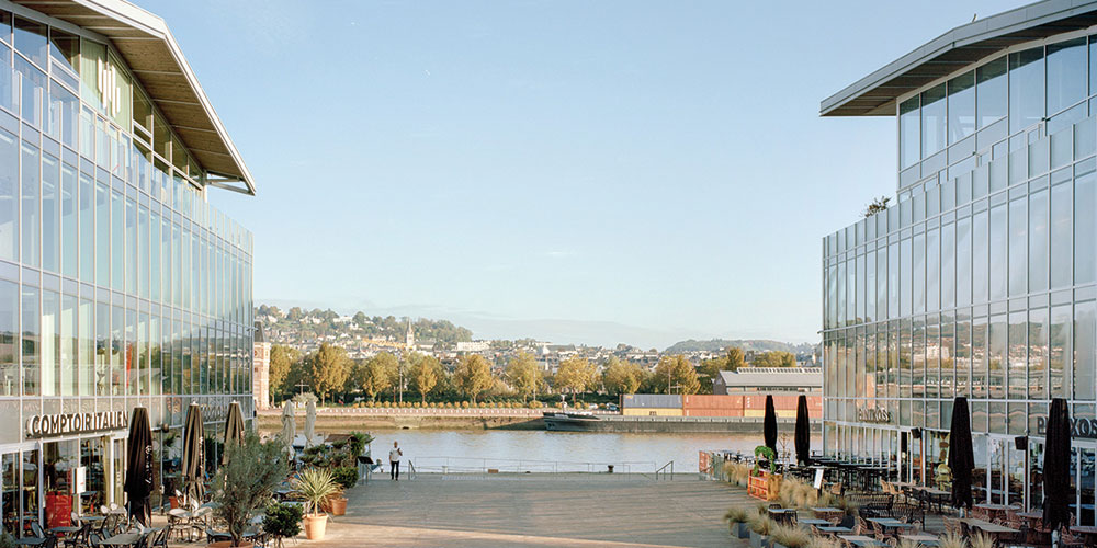 Après l’opération « Réinventer Paris », toutes les villes se réinventent et pour cause, il faut élargir les territoires et leur donner de nouveaux usages urbains avec la dynamique de nouveaux Eco-quartiers. Le patrimoine portuaire et industriel sont à ce titre les supports d’une nouvelle attractivité de la ville, avec un paysage retrouvé et le charme de nouvelles infrastructures associé à celui du fleuve. Rouen se réinvente donc depuis la Seine autour de laquelle se distribue son centre historique sur la rive droite et son centre administratif sur sa rive gauche. Autrefois appelée cité-dortoir, cette dernière retrouve ainsi de l’attrait au travers de la transformation de ses quais, à l’instar de ceux de la rive droite largement investis depuis quelques années. Un nouvel essor auquel participe la réhabilitation des anciens hangars portuaires qui s’ouvrent à une programmation plus éclectique pour attirer tous les publics. C’est ce que propose le Hangar 105 dans son intégralité qui, situé en bord de Seine sur une parcelle quelque peu restreinte mais relativement longue, expose depuis 2023 une architecture de verre des plus contemporaine. De l’autre côté du pont, cette réalisation prolonge la ville, lui offre de nouvelles perspectives de promenade, de loisirs et d’espaces de travail tout en octroyant un certain recul aux citadins. Les masses de verre du 105 s’étirent ainsi sur la totalité de l’emprise au sol en se scindant en deux bâtiments distincts afin de respecter et de poursuivre le rythme des hangars réhabilités. Connecté au plus près du Pont Guillaume le Conquérant en sortie de la rive droite, le 105bis abrite l’espace de coworking et les bureaux du maître d’ouvrage tandis que le 105 accueille d’ores et déjà crèche, cafés/restaurants en rez-de-chaussée et en rooftop, en attendant l’installation d’un futur grand hôtel, autre pivot financier du programme. Séparés par un forum ou cour partagée, les deux bâtiments partagent la même porosité en rez-de-chaussée, matérialisée par une large strate vitrée ouverte sur cet espace public en vue d’offrir des usages autant dedans que dehors. Tous deux s’identifient au même projet par leur écriture architecturale commune avec pour caractéristiques ses charpentes métalliques, ses toitures ondulantes en attique et ses façades habillées d’une enveloppe de verre et d’aluminium anodisé naturel avec effet damier.